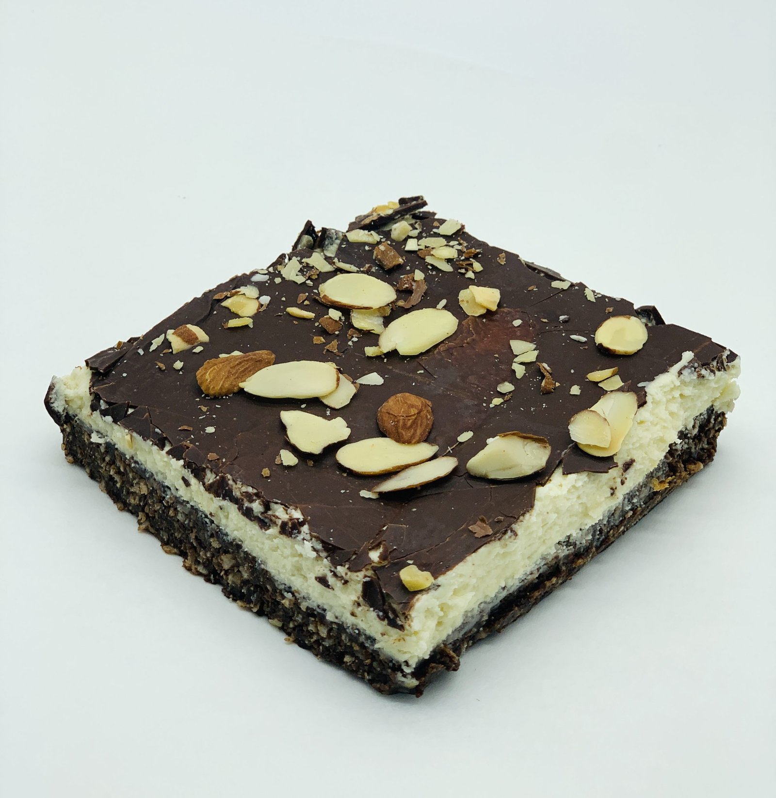 $4.95The classic three layer bar with chocolate and coconut, vanilla cream, chocolate ganache and toasted almonds. A 4 inch square can be cut into 4-8 servings.